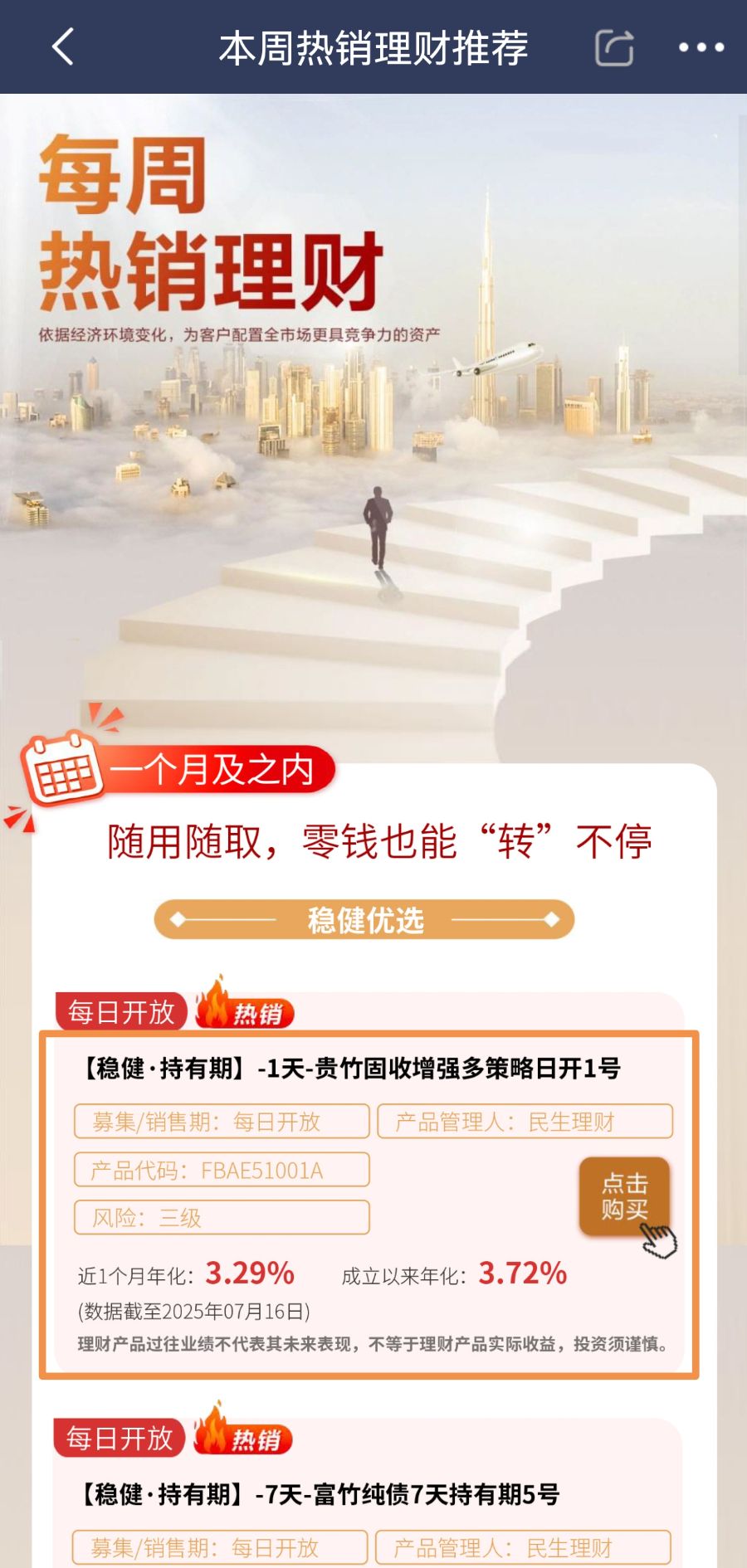 近期債市調整、股市一度突破3600點,“股債蹺蹺板”效應再現。隨著投資難度加大,通過多元化資產配置分散風險的多元配置策略越來越受歡迎。理財通評評“理”第44期繼續測評銀行熱銷產品,本期測評民生銀行APP“每周熱銷理財”中排第一的產品:貴竹固收增強多策略日開1號。該產品為一款多策略產品,通過多元化配置分散風險以及增加多元化收入來源。