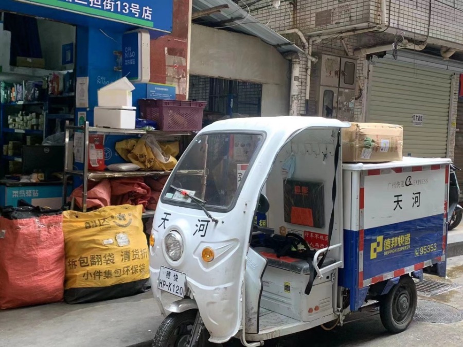 廣州天河一家菜鳥驛站門口,德邦快遞員正在卸貨