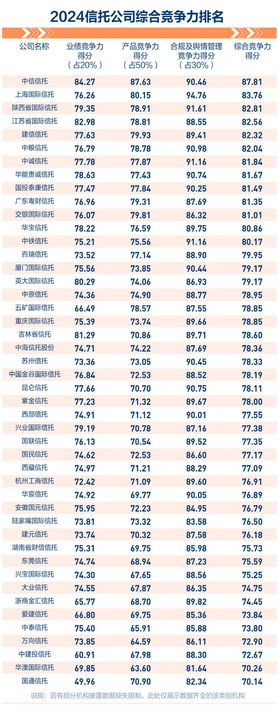 相比之下,排名靠后的幾家公司在得分上存在明顯不足:例如,百瑞信托(總分79.95)其產(chǎn)品競爭力得分未達(dá)80;英大信托(總分79.17)在產(chǎn)品競爭力和輿情方面均為其相對較低的得分點(diǎn);五礦信托(總分78.85)和重慶信托(總分78.85)則分別在產(chǎn)品競爭力和輿情上存在短板;而吉林信托(總分78.60)的產(chǎn)品競爭力和輿情得分在榜單中雙雙偏低。