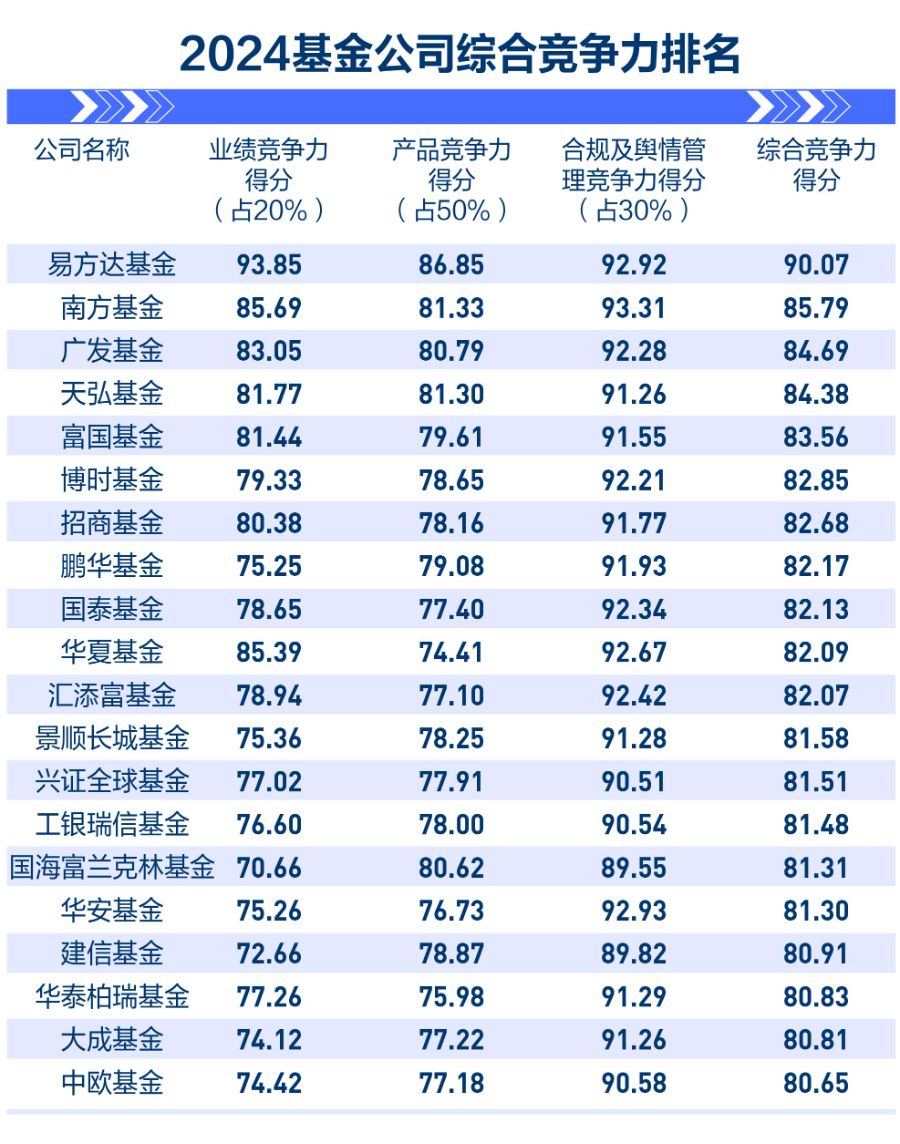 這六家公司的領(lǐng)先優(yōu)勢各有側(cè)重。本次總打分排在的易方達(dá)基金是唯一總分突破90分的公募基金機(jī)構(gòu),其核心優(yōu)勢在于各維度實(shí)力的極致均衡,尤其是在業(yè)績競爭力(93.85分)和產(chǎn)品競爭力(86.85分)這兩個高權(quán)重指標(biāo)上表現(xiàn)卓越,且合規(guī)項(xiàng)獲得滿分,綜合實(shí)力無顯著弱項(xiàng)。
